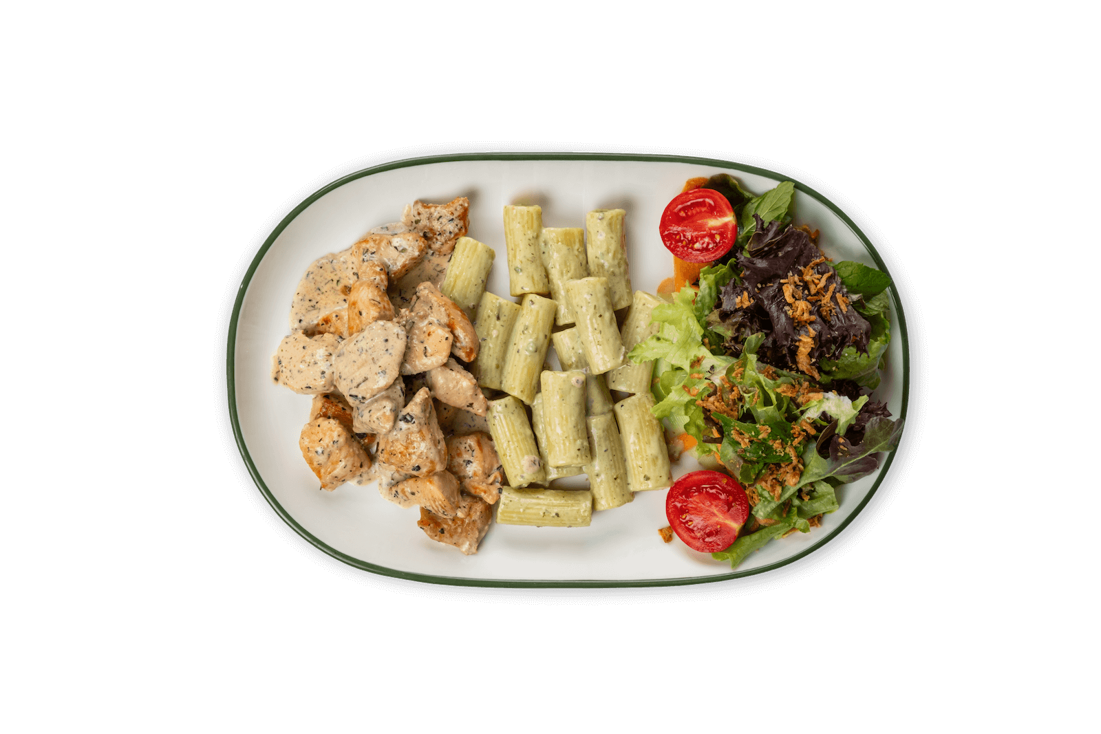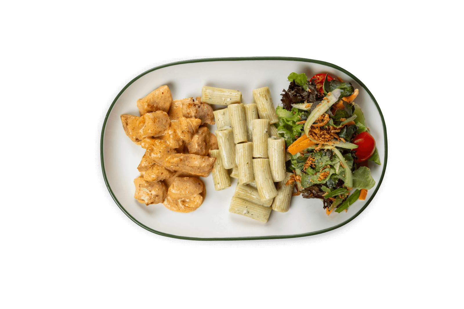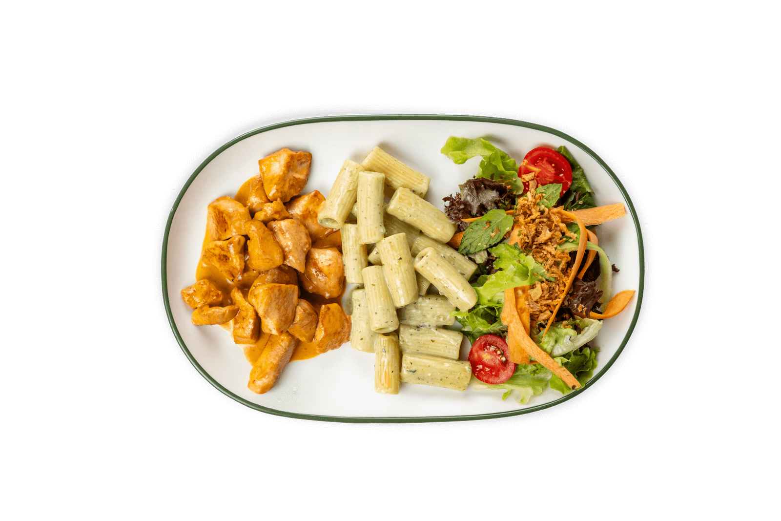 Tikka Soslu Tavuk, Fesleğen, Krema, Makarna, Yeşil Salata, Soğan Cipsi