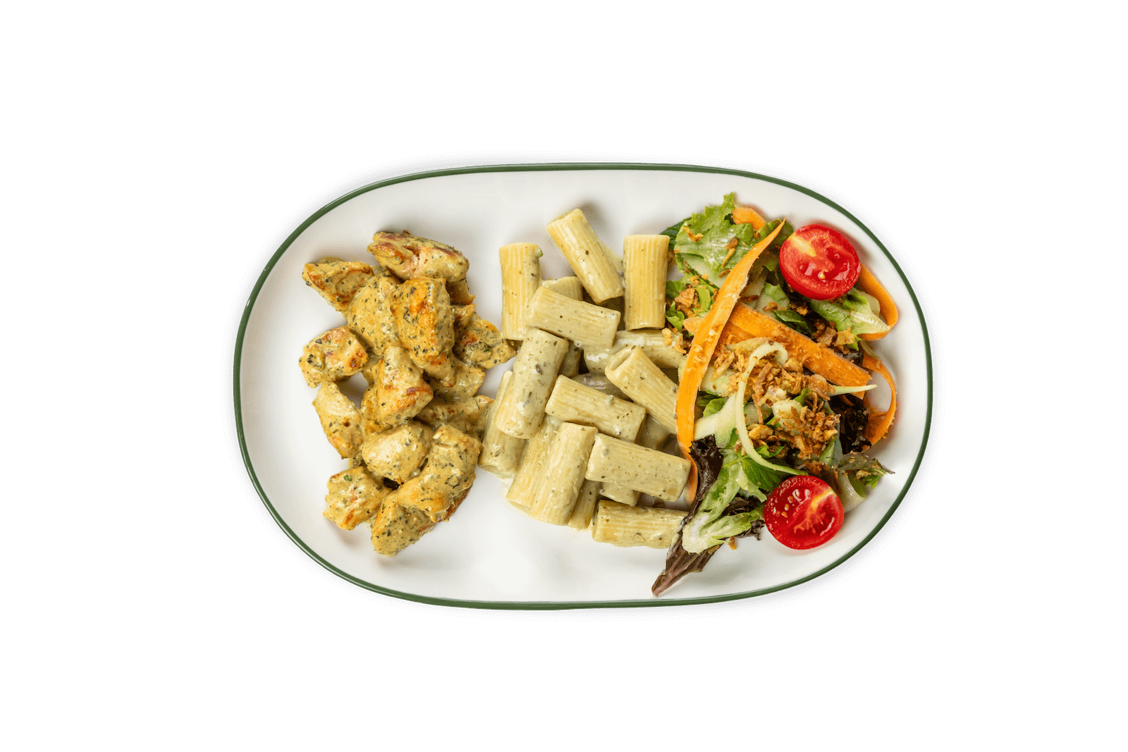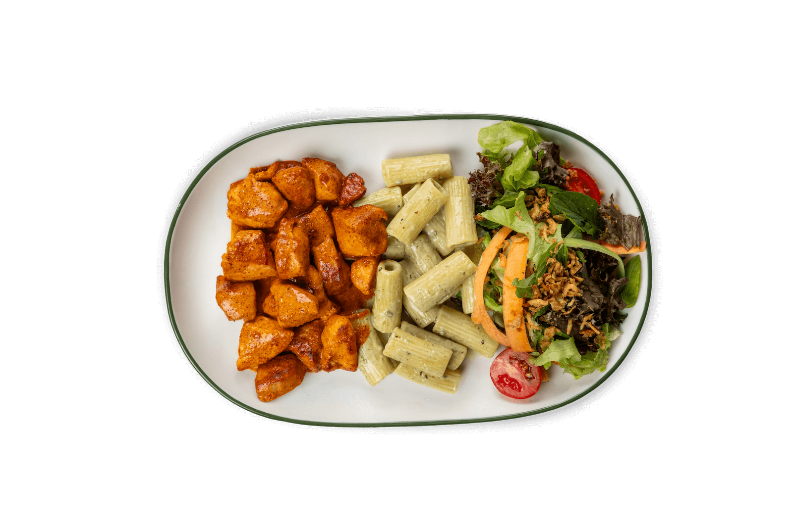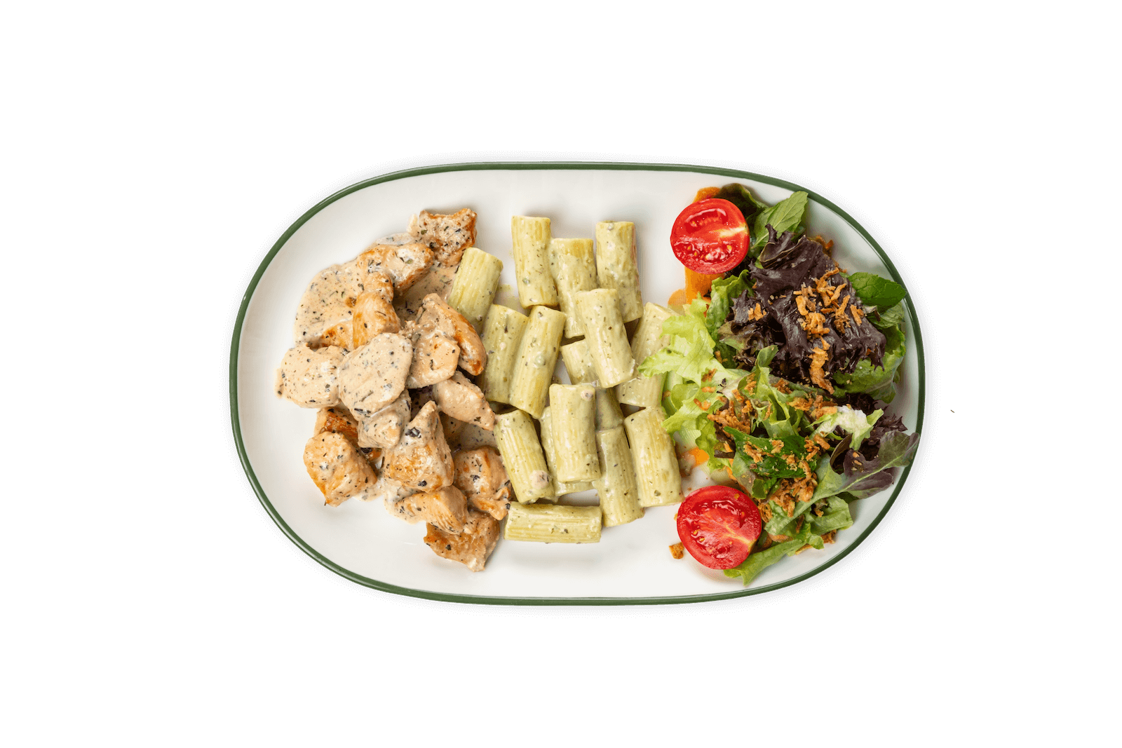 Tikka Soslu Tavuk, Fesleğen, Krema, Makarna, Yeşil Salata, Soğan Cipsi