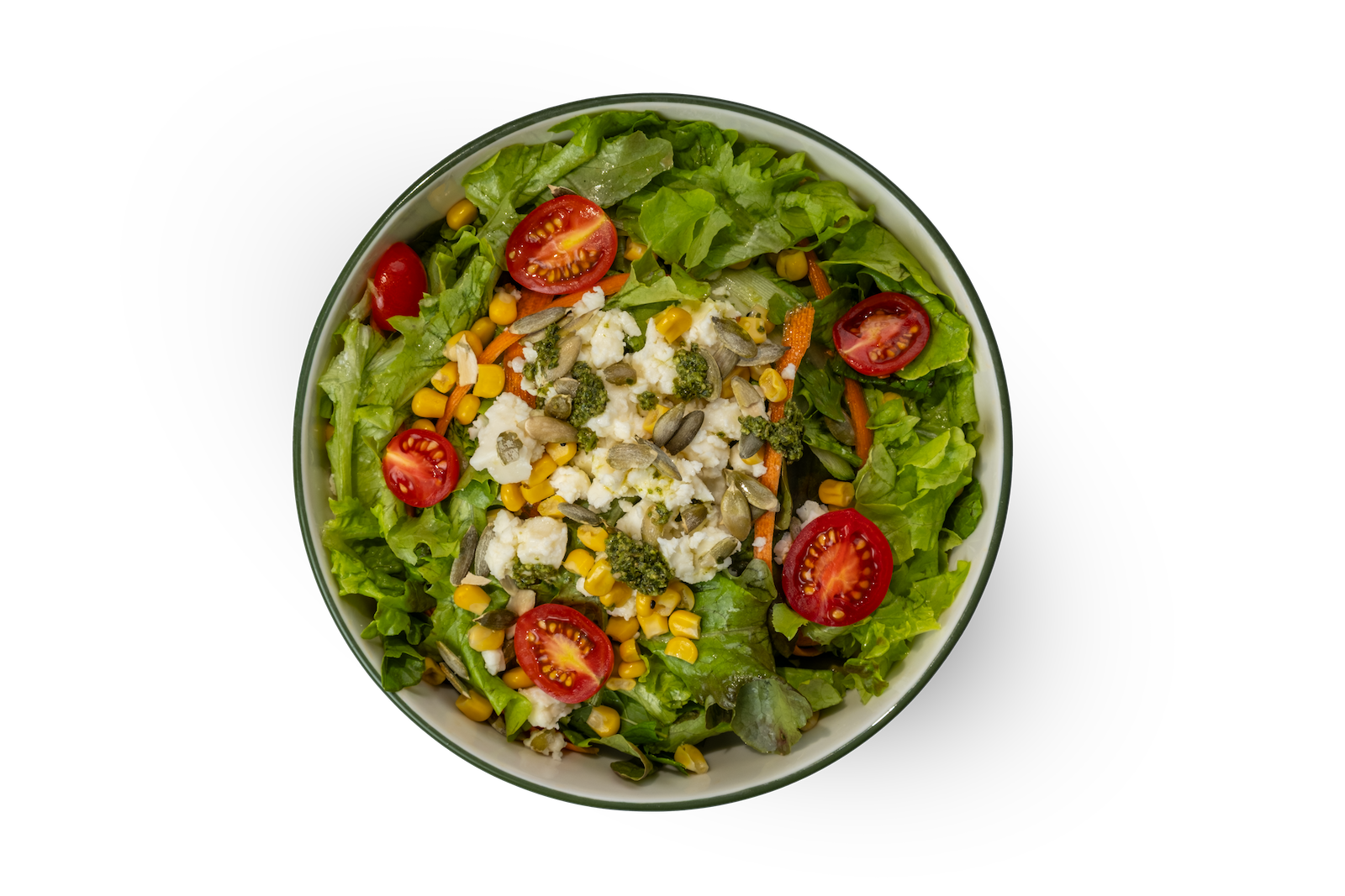 Beyaz Peynir, Mix Yeşillik, Domates, Salatalık, Tane Mısır, Kabak Çekirdek İçi, Pesto Sos