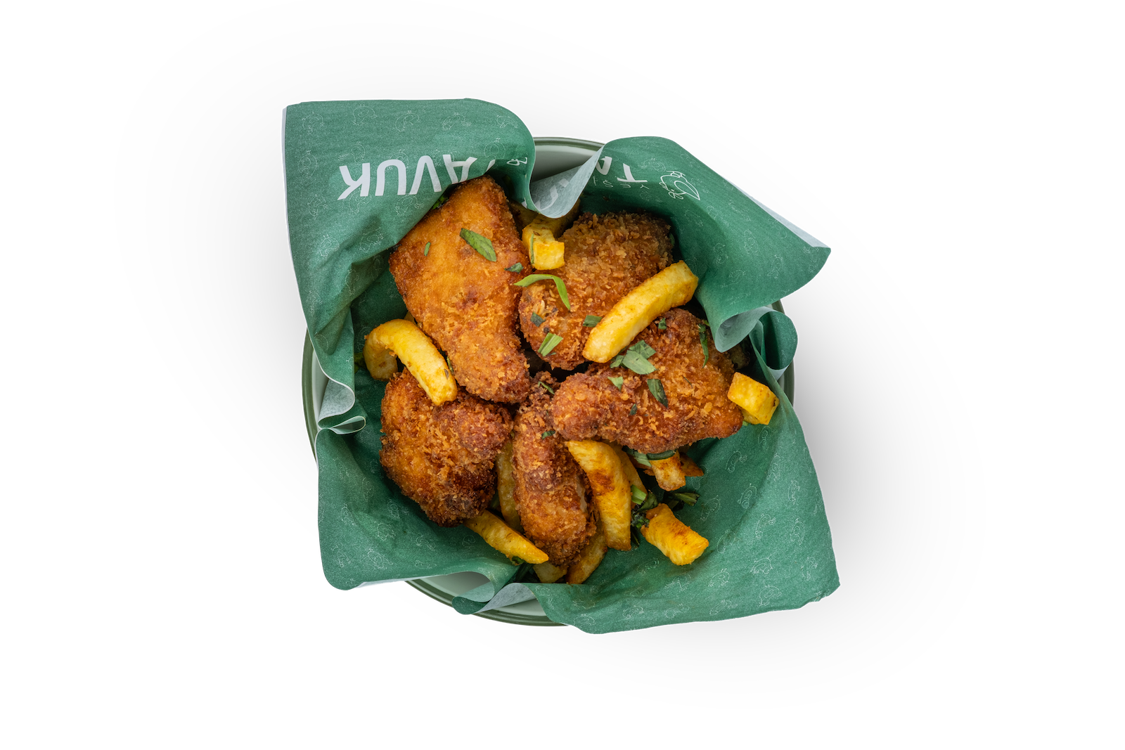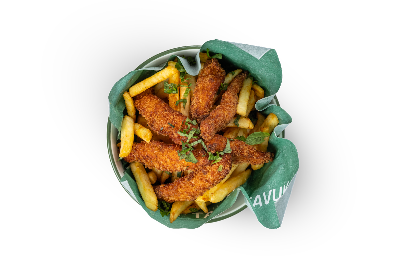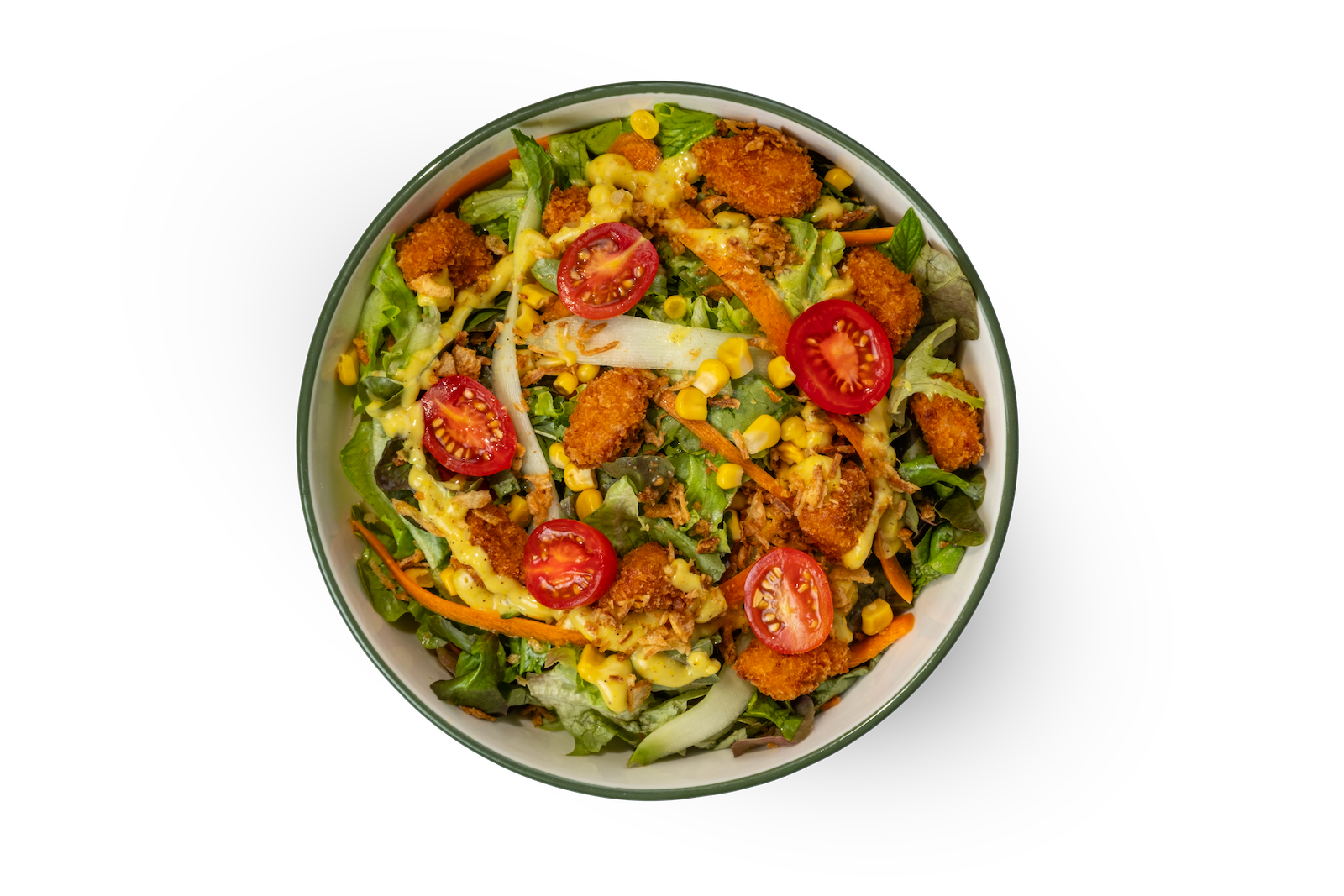 Çıtır Tavuk Parçaları, Yeşillik, Domates, Salatalık, Havuç, Tane Mısır, Ballı Hardal, Soğan Cipsi ve Pesto