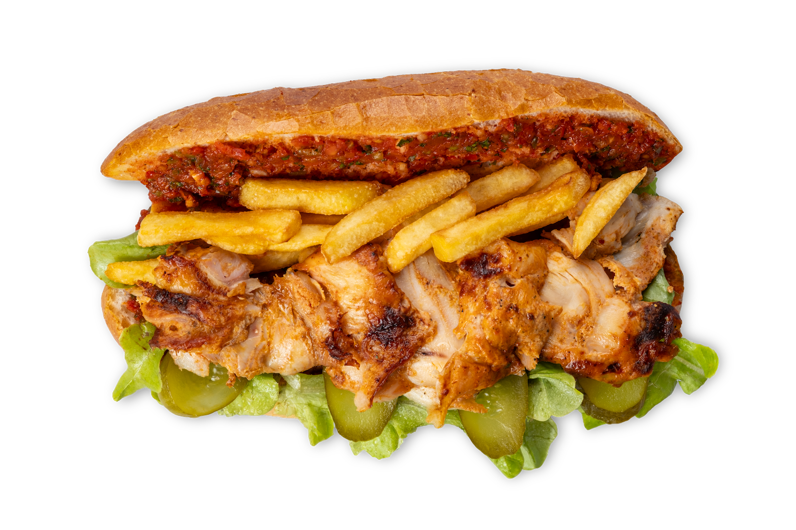 Yarım Tavuk, Pilav, Kızarmış Patates, Salata, Acı Sos