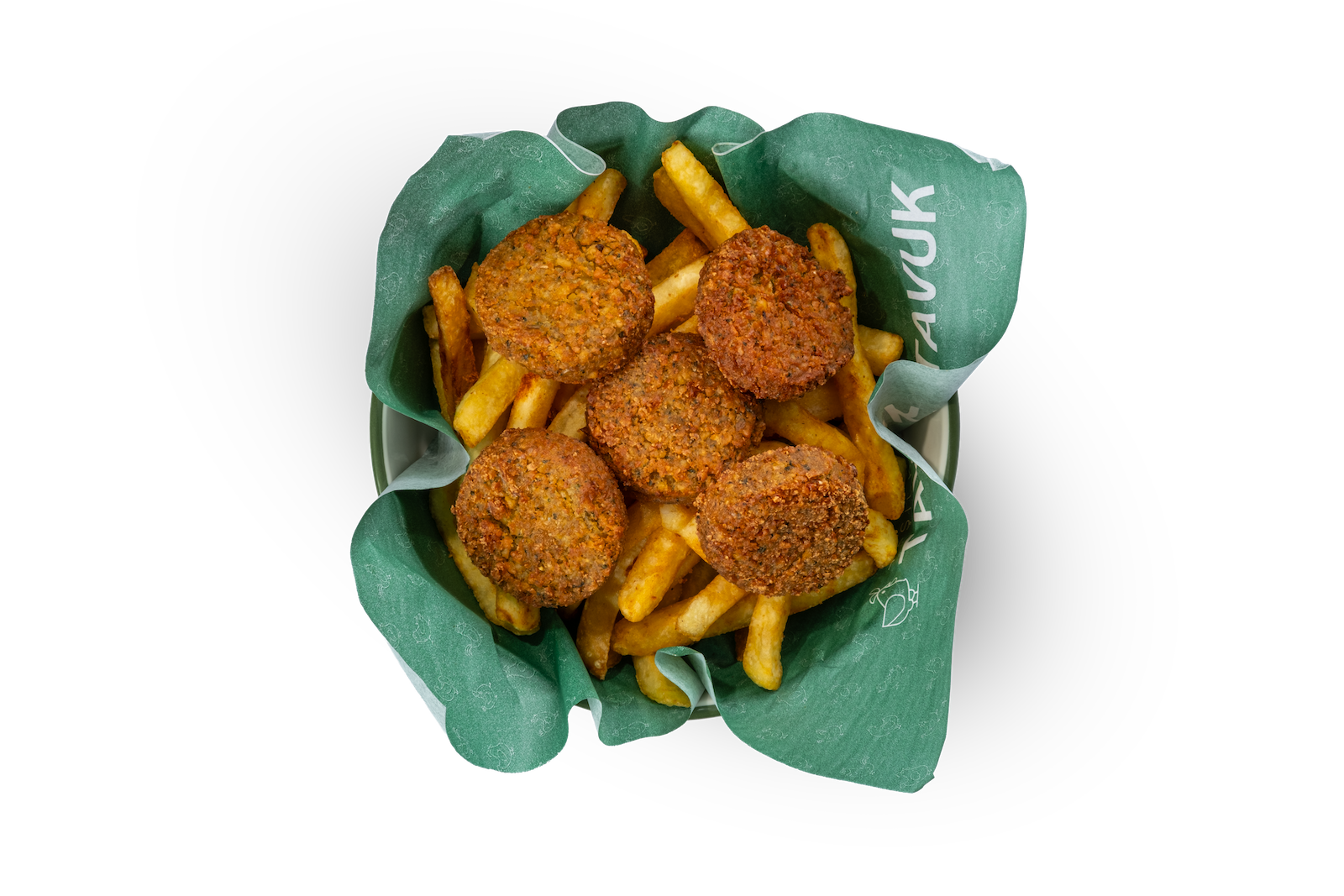 Falafel, Yeşillik, Domates, Salatalık, Tahin ve Haşlanmış Nohut, Soğan Cipsi ve