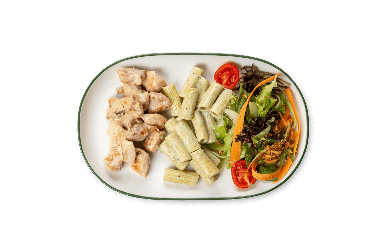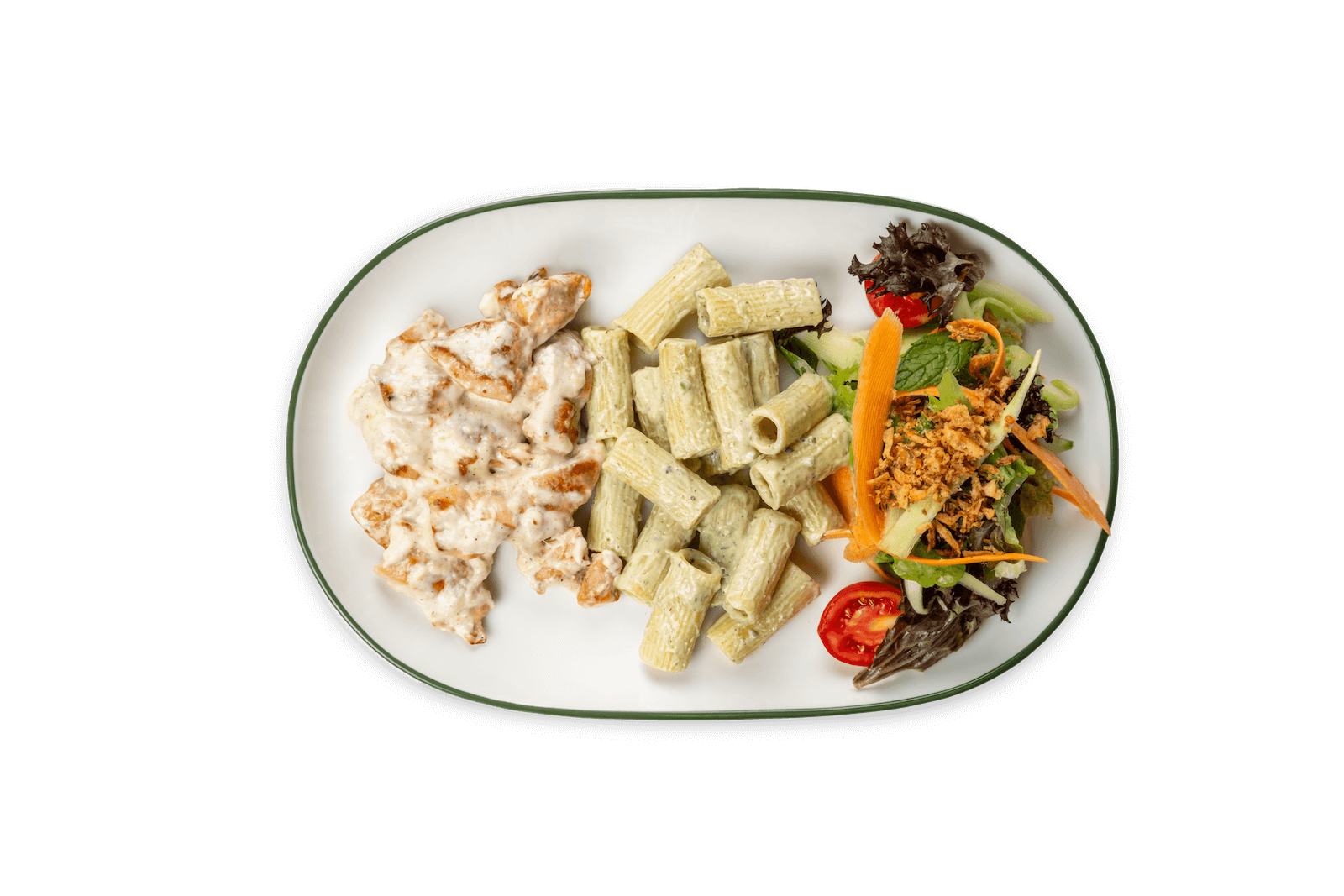 Piliç Eti, Fesleğen, Krema, Makarna, Yeşil Salata, Soğan Cipsi