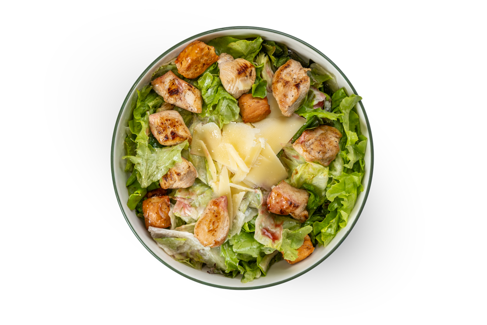Kızarmış Tavuk Parçaları, Göbek Salata, Kızarmış Ekmek, Parmesan ve Sezar Sosu ile