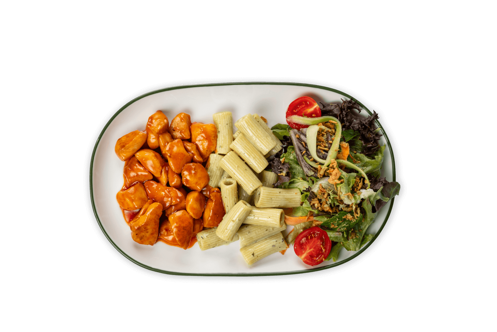 Tatlı Ekşi Soslu Tavuk Lokum, Fesleğen, Krema, Makarna, Yeşil Salata, Soğan Cipsi